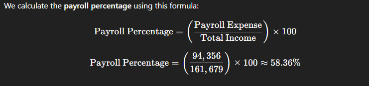 A payroll percentage of 58.36% means more than half of your total income is being used to cover payroll expenses.